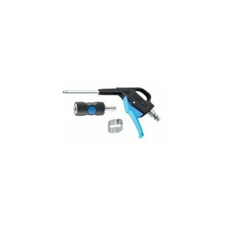 Kit comprenant une soufflette en composite polyamide avec buse métallique, un raccord rapide femelle cannelé pour tuyau Ø int. 8 mm et un collier de serrage à oreille.